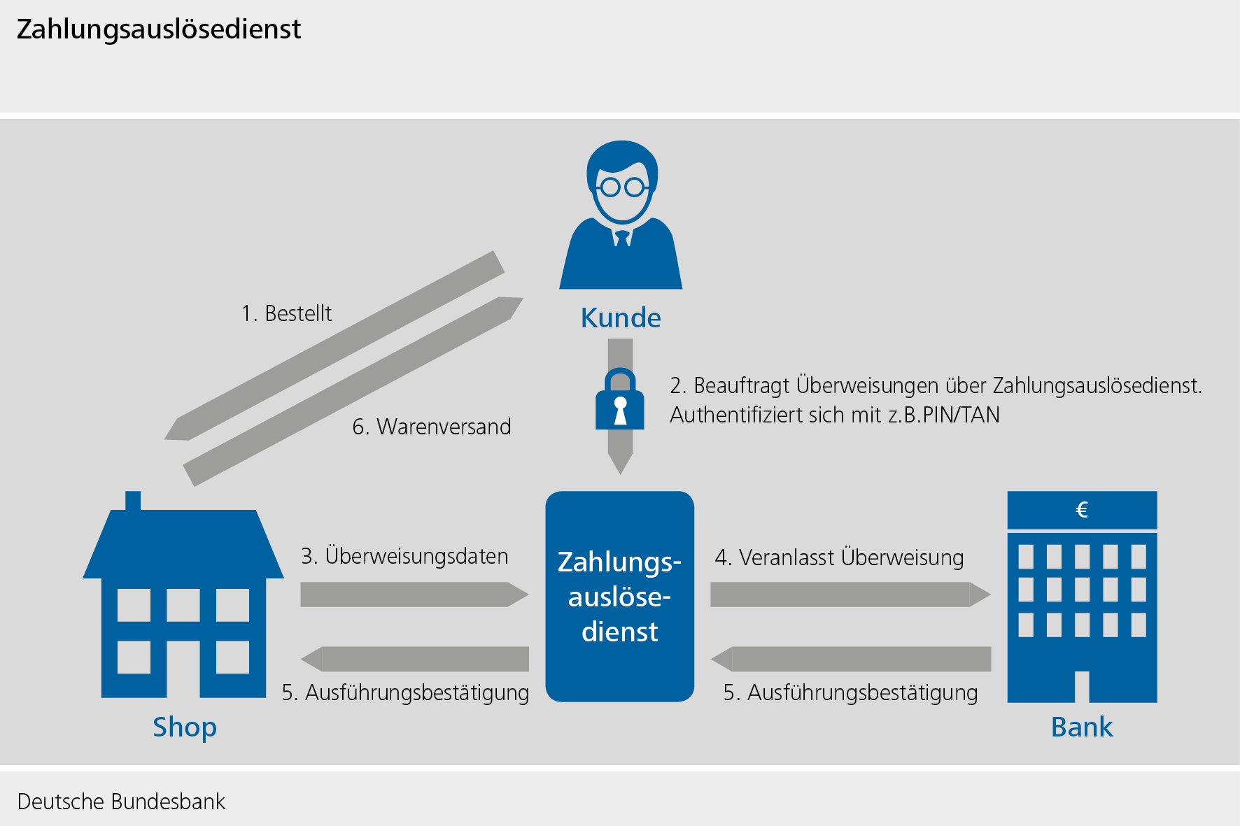Ein Zahlungsauslösedienst wird vom Zahler beauftragt, zulasten seines bei einem anderen Zahlungsdienstleister (z.B. Kreditinstitut) geführten Zahlungskontos eine Überweisung auszulösen. In der Regel wird der Zahlungsauslösedienst auf der Händlerseite im Internet als eine Möglichkeit des Bezahlens angeboten. Er bestätigt dem Händler auch die Ausführung der Überweisung, damit dieser z. B. die Ware verschicken kann.