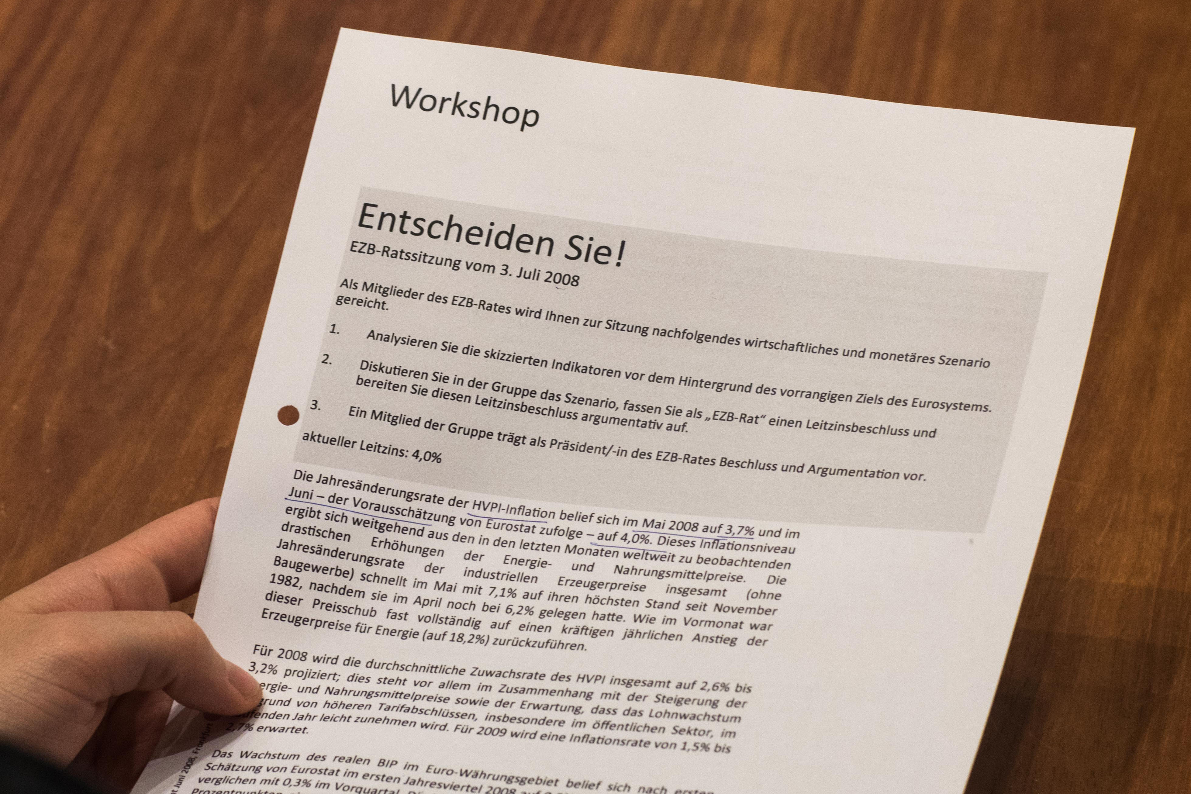Ein Nachmittag in der hessischen Hauptverwaltung der Bundesbank: Eine Schülerin erklärt ihrer Klasse, weshalb sie eine Senkung des Leitzins empfiehlt. Das Team der Schülerin hat das Szenario einer geldpolitischen EZB-Ratssitzung aus dem Jahr 2013 durchgespielt und ist zu dem Schluss gekommen, dass der Zins gesenkt werden muss, weil die Inflation zu niedrig ist.