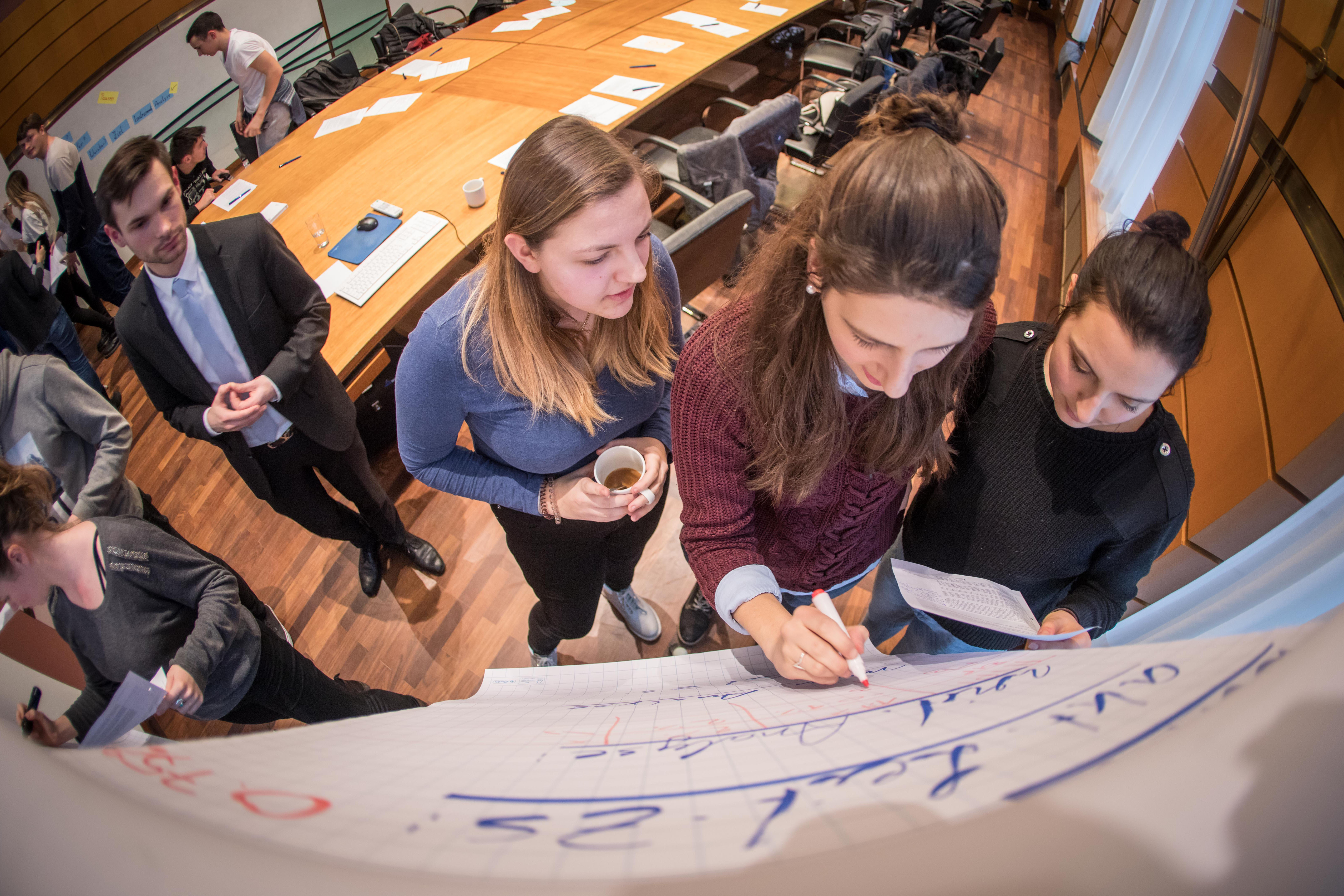 Einblick in einen Schülerworkshop Eine Schülerin erklärt die Zinspolitik der EZB