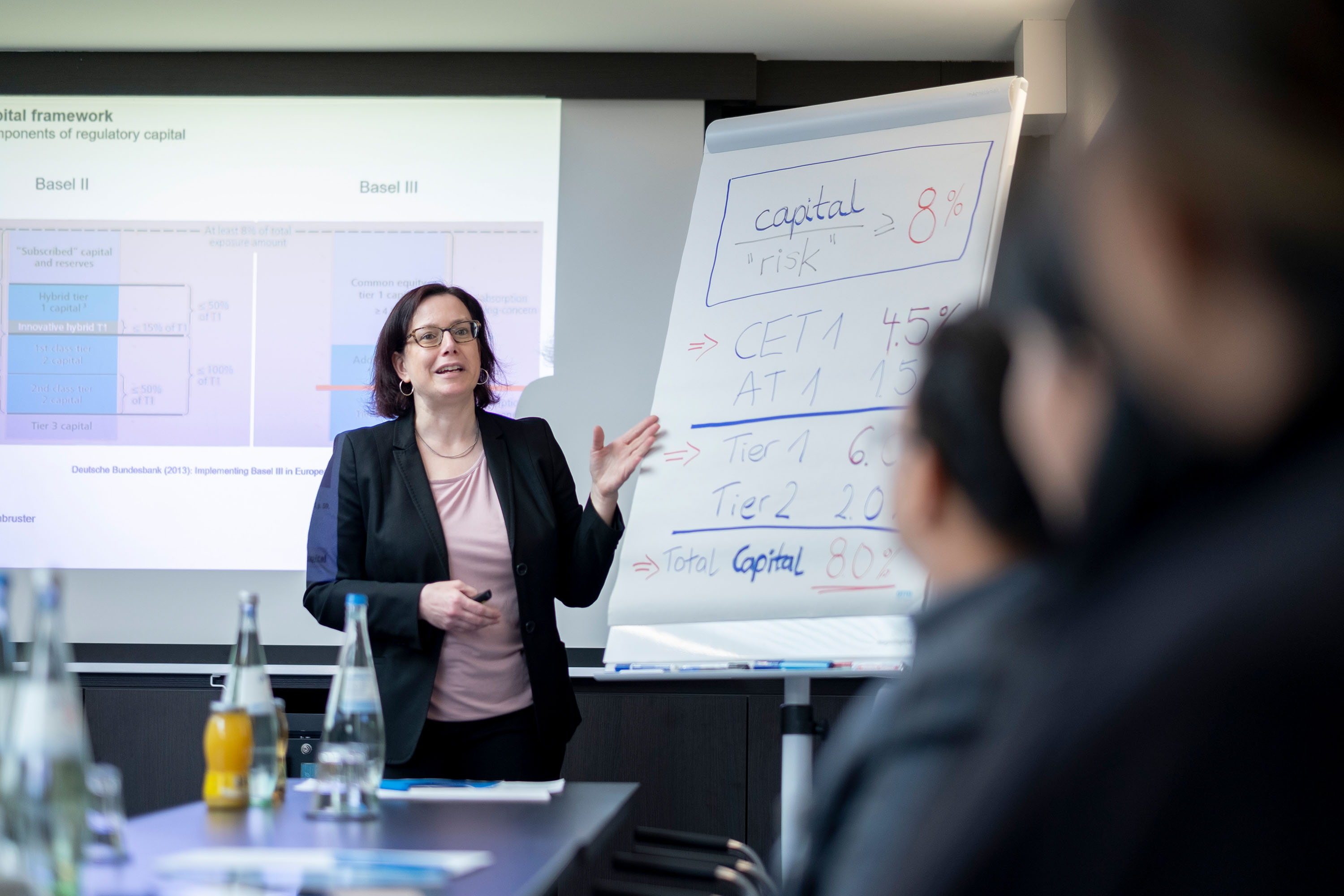 Ich bin sehr froh hier zu sein und nicht mehr in eine Kamera sprechen zu müssen“. Melanie Armbruster aus dem Zentralbereich Banken und Finanzaufsicht macht keinen Hehl daraus, dass Sie sich auf den Neustart der Präsenzkurse gefreut hat. Ihr Vortrag zum Thema „Own Funds“ ist der Auftakt der einwöchigen Seminarreihe „Introduction to the Basel Framework“.