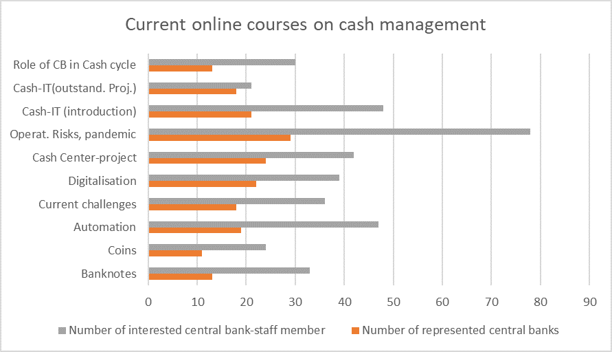 Bedauerlicherweise konnten 2020 die vier geplanten Internationalen Zentralbankkurse zu Bargeldthemen, die als Präsenzveranstaltungen in Frankfurt am Main, in München und in Mainz vorgesehen waren, nicht stattfinden. Doch wurde als Ersatz im Oktober 2020 eine Online-Kursreihe aufgesetzt, die noch bis April 2021 läuft.