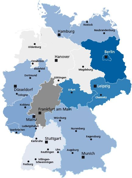 Göttingen branch Rostock branch Hamburg branch Neubrandenburg branch Berlin branch Osnabrück branch Oldenburg branch Hannover branch Magdeburg branch Erfurt branch Leipzig branch Chemnitz branch Bielefeld branch Dortmund branch North Rhine-Westphalia Cologne branch Koblenz branch Mainz branch Ludwigshafen branch Saarbrücken branch Ulm branch Reutlingen branch Villingen-Schwenningen branch Freiburg branch Stuttgart branch Karlsruhe branch Frankfurt am Main branch Würzburg branch Nuremberg branch Regensburg branch Augsburg branch Munich branch