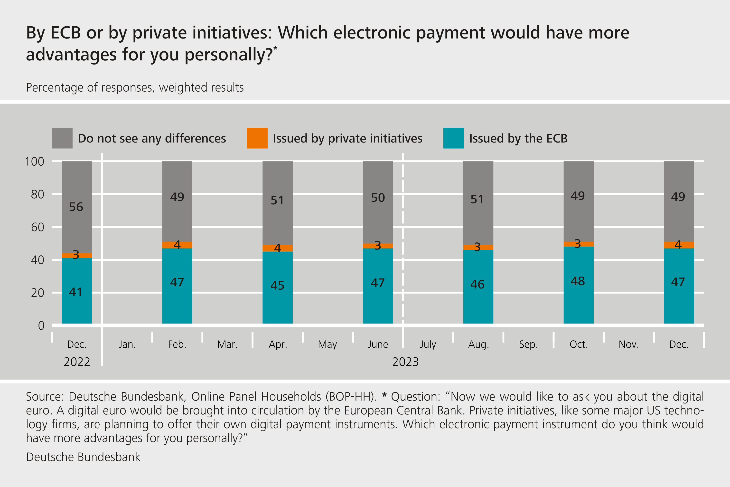In the past, we regularly asked participants whether an electronic payment instrument issued by the ECB or by private initiatives would have more advantages for them personally. Here, you can see the results for the period from December 2022 to December 2023.