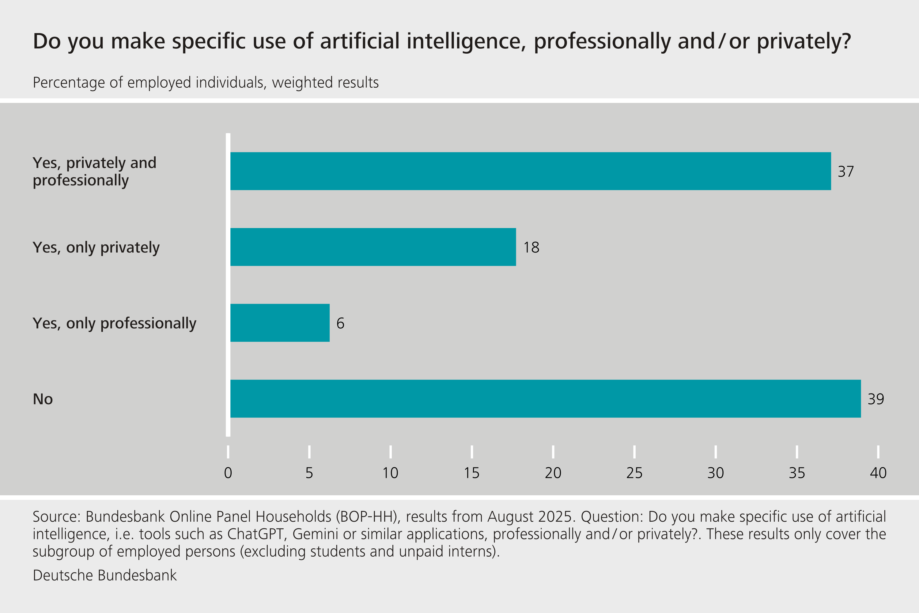 In August 2025, we asked our participants whether they were making specific use of artificial intelligence, i.e. tools such as ChatGPT, Gemini or similar applications. You can see the results for the subgroup of employed persons, excluding students and unpaid interns here.