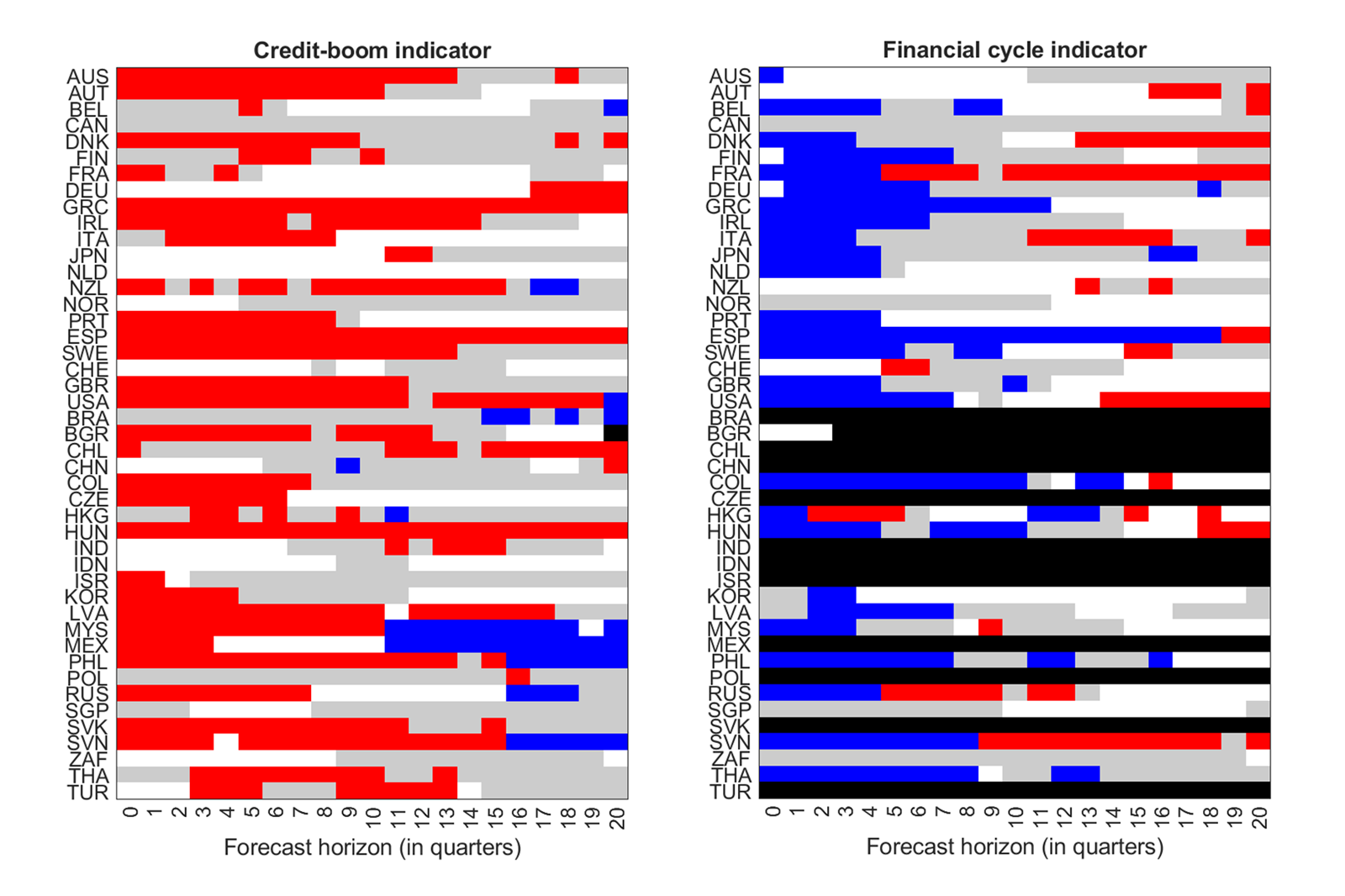 Figure 1 graphically illustrates these conclusions for the two successful indicators. Red or blue means that an indicator passes our statistical test for the respective horizon and country and thus flags systemic risk. Red signifies that a high systemic risk is associated with a high indicator value. Blue means that a high systemic risk is implied by a low indicator value. Grey or white signify that the indicator does not pass our statistical test, while black denotes insufficient data.