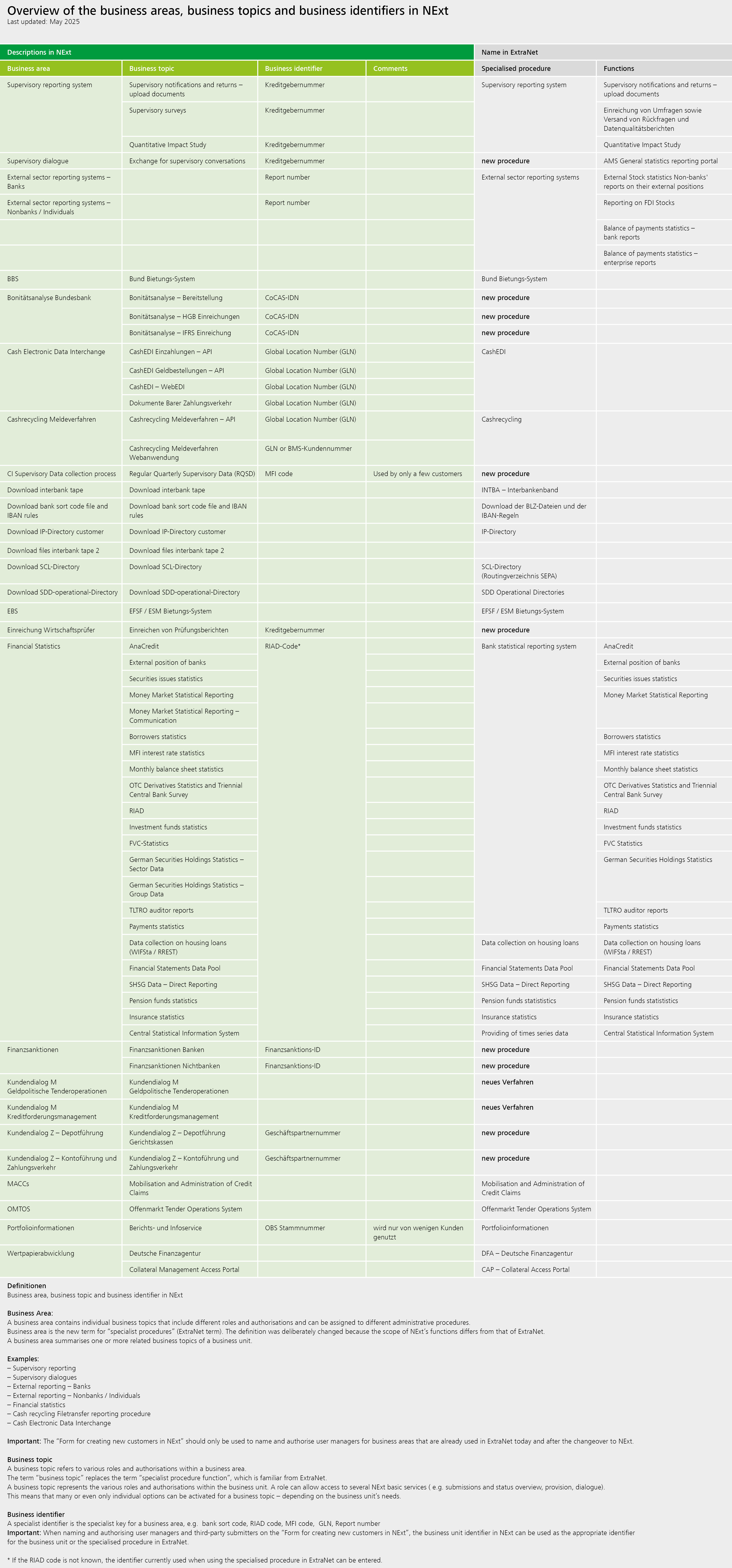 In the following overview, all future specialist procedures and specialist procedure functions from the ExtraNet are compared with the new business areas and specialist topics in NExt. Availability in NExt will be proactively announced.