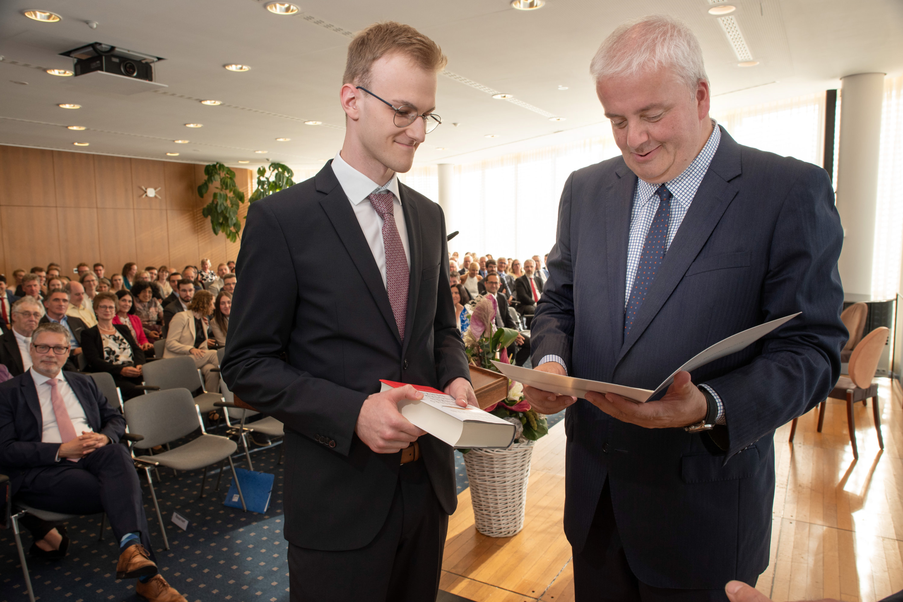 Vorstandsmitglied Burkhard Balz, zu dessen Dezernat der Zentralbereich Ökonomische Bildung und damit auch die Hochschule in Hachenburg gehört, ermunterte die Absolventinnen und Absolventen in seiner Rede zudem dazu, flexibel und offen für Veränderungen zu bleiben, ganz unabhängig davon, in welchen Bereichen Sie künftig arbeiten werden. So wie der aktuelle Abschlussjahrgang im Studium bewiesen habe, sich schnell an verändernde Umstände anpassen zu können, wird Ihnen diese Flexibilität auch in Ihrer Karriere zugutekommen. Von einer ausgeprägten Neugier, dem Wunsch nach kontinuierlichem Weiterbilden und einem starken innerbetrieblichen Netzwerk, so Balz weiter, werden Sie ebenfalls ungemein profitieren. Wohin auch immer Ihr Weg Sie führen wird, ich wünsche Ihnen alles Gute und viel Erfolg.
