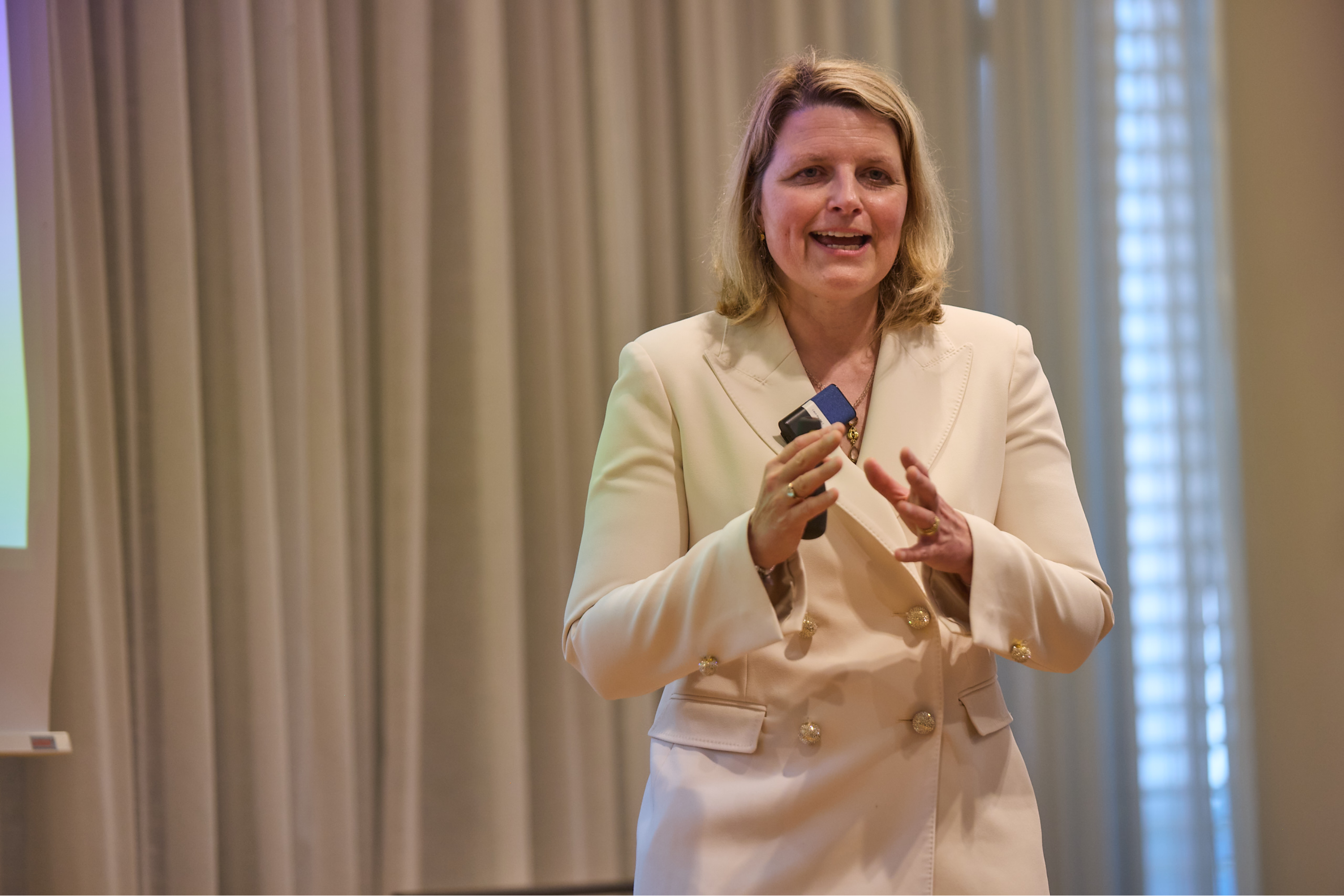 In ihrem Impulsvortrag ging die promovierte Volkswirtin zuvor auf die abgekühlte Lage der deutschen Wirtschaft ein, die sich seit der Covid-Krise in einer Seitwärtsbewegung befinde. Auch die Exportwirtschaft könne im Gegensatz zu früheren Konjunkturzyklen das Ruder nicht herumreißen, wie sie hervorhob: „2010 war Deutschland bei 240 von 5.300 Waren mit einem Marktanteil von über 30 % Weltmarktführer, heute sind es nur noch 180.“ Zudem bremse die Unsicherheiten, auch ausgelöst durch geopolitische Spannungen, die Investitionsbereitschaft deutscher Unternehmen.