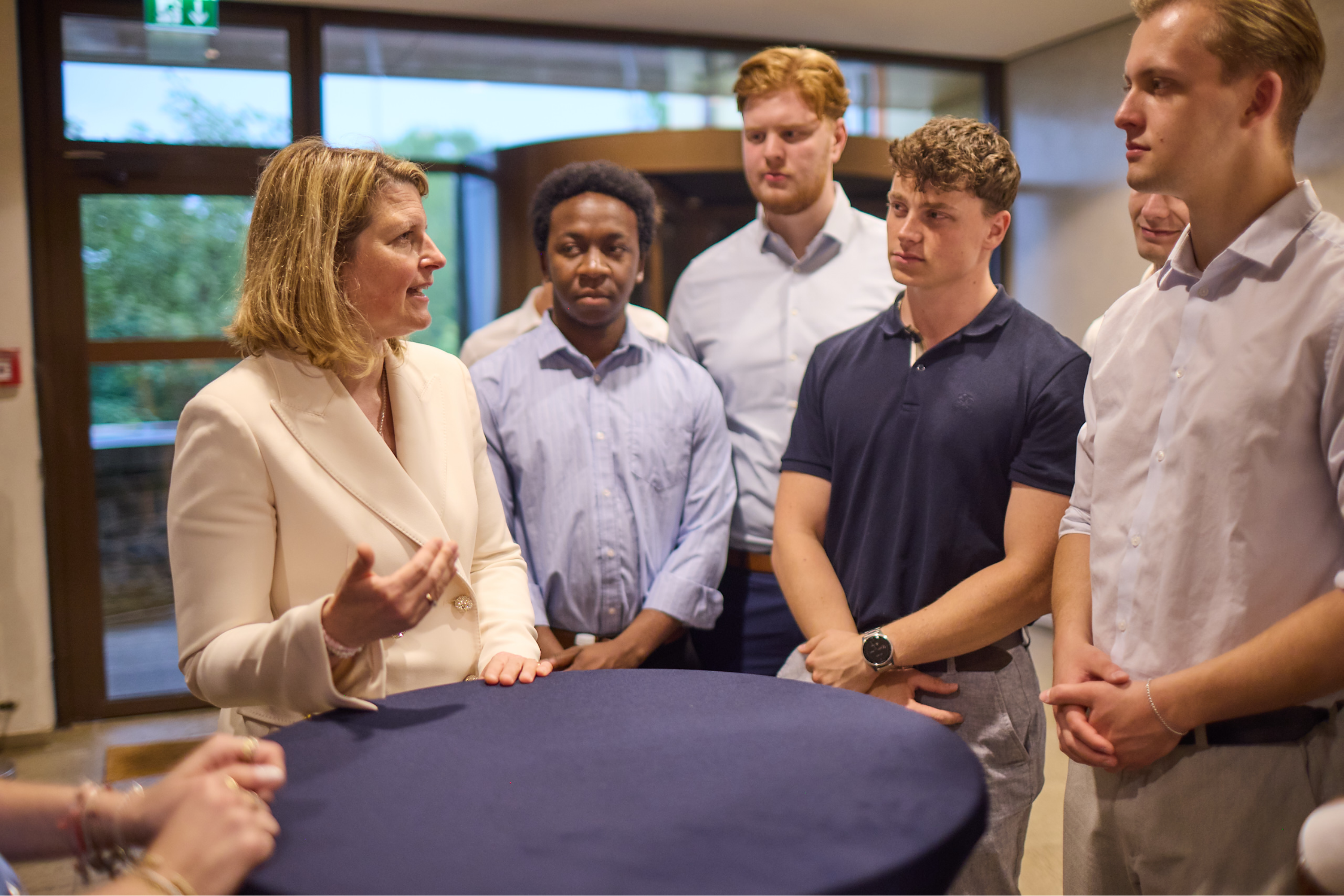 Die Gewitterwolken im Westerwald verzogen sich allmählich. Das Gespräch der Studierenden mit Vorständin Fritzi Köhler-Geib setzte sich aber auch nach 21.30 Uhr munter fort. Natürlich ging es um die anstehenden Herausforderungen für die deutsche Wirtschaft, aber die Fritzi Köhler-Geib appellierte auch an die Studierenden, die Chancen der Digitalisierung in Hachenburg zu nutzen – schließlich wird dieser Bereich dort im Curriculum erheblich ausgeweitet. Erst gegen 22 Uhr verließ die Vorständin die Hochschule der Bundesbank. „Es war toll, dass ein Mitglied des Vorstands sich so viel Zeit für uns genommen hat“, sagte Mara Dreier, Studentin aus dem Grundstudium, nach dem Gespräch mit der Vorständin.