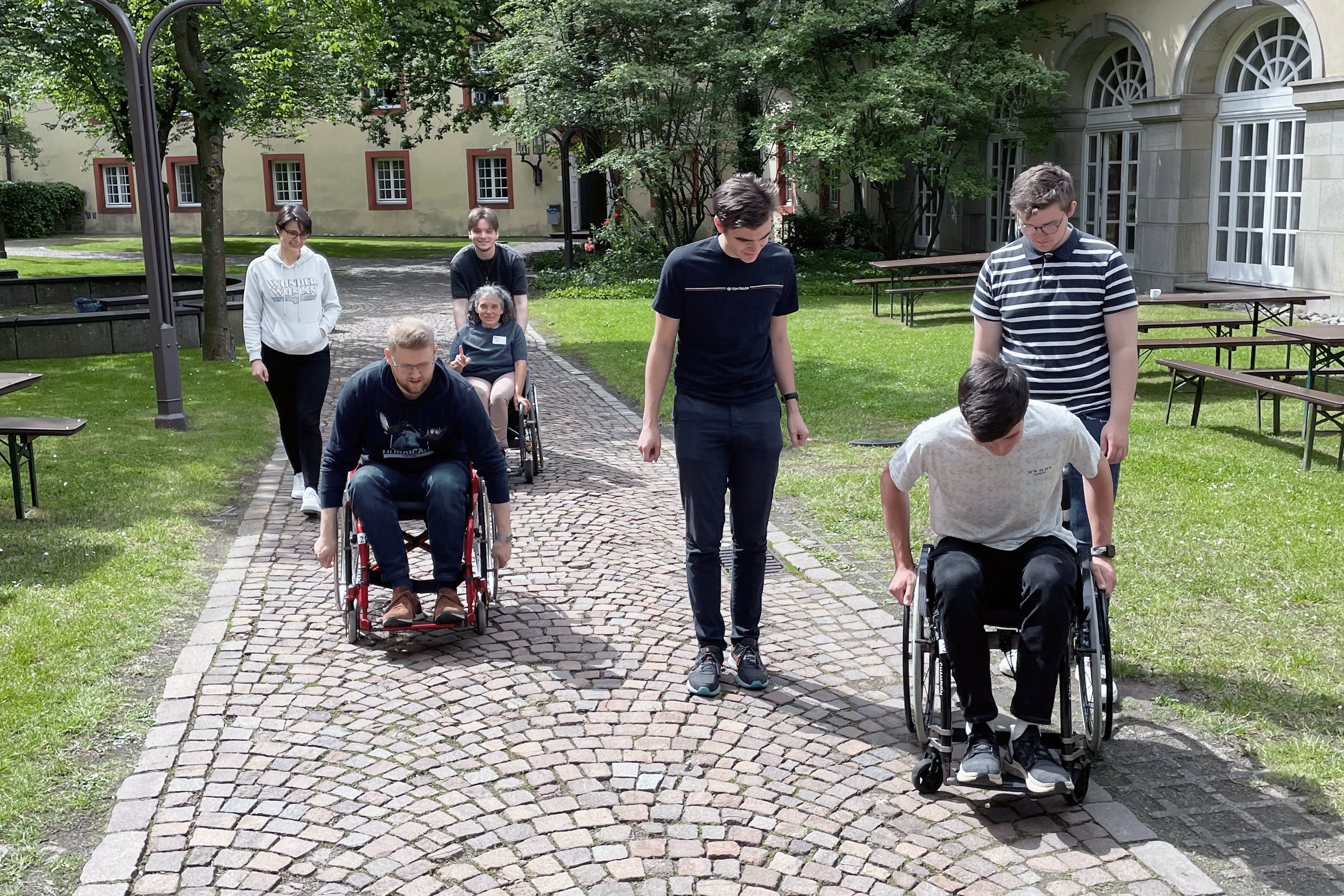 Nach der Begrüßung bekamen die Studierenden die Möglichkeit, die Perspektive von Menschen mit Behinderungen einzunehmen. Beispielsweise fuhren sie mit einem Rollstuhl durch das Schloss und setzten sich auf diese Weise aktiv mit den Herausforderungen und Bedürfnissen von Rollstuhlfahrerinnen und -fahrern auseinander. Die alltäglichen Schwierigkeiten von Menschen mit Mobilitätseinschränkungen wurden ihnen dabei plakativ vor Augen geführt.