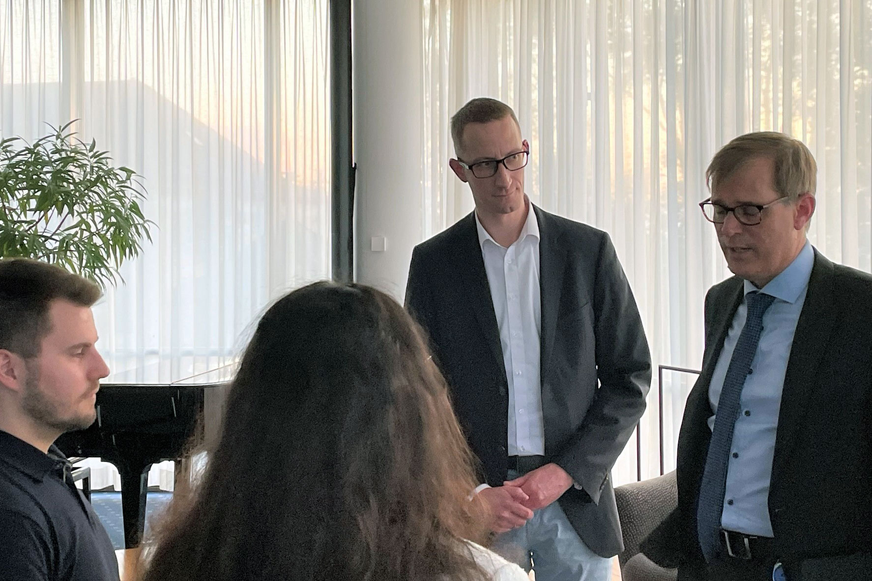 Seit über 40 Jahren nutzt die Hochschule ihre beiden Kaminzimmer, um mit hochrangigen Gästen über aktuelle Zentralbankthemen zu diskutieren. Am 9. August 2023 stellte sich Dr. Julian Reischle, Leiter des Zentralbereichs Zahlungsverkehr und Abwicklungssysteme, den Fragen des Publikums rund um den digitalen Euro. Aufgrund des großen Publikumsinteresses von 33 Personen – neben Studierenden der Hochschule aus verschiedenen Studienabschnitten auch sieben Lehrende – musste die Veranstaltung kurzfristig vom Kaminzimmer in den Vortragssaal verlegt werden, damit alle angemeldeten Personen einen Platz finden konnten.
