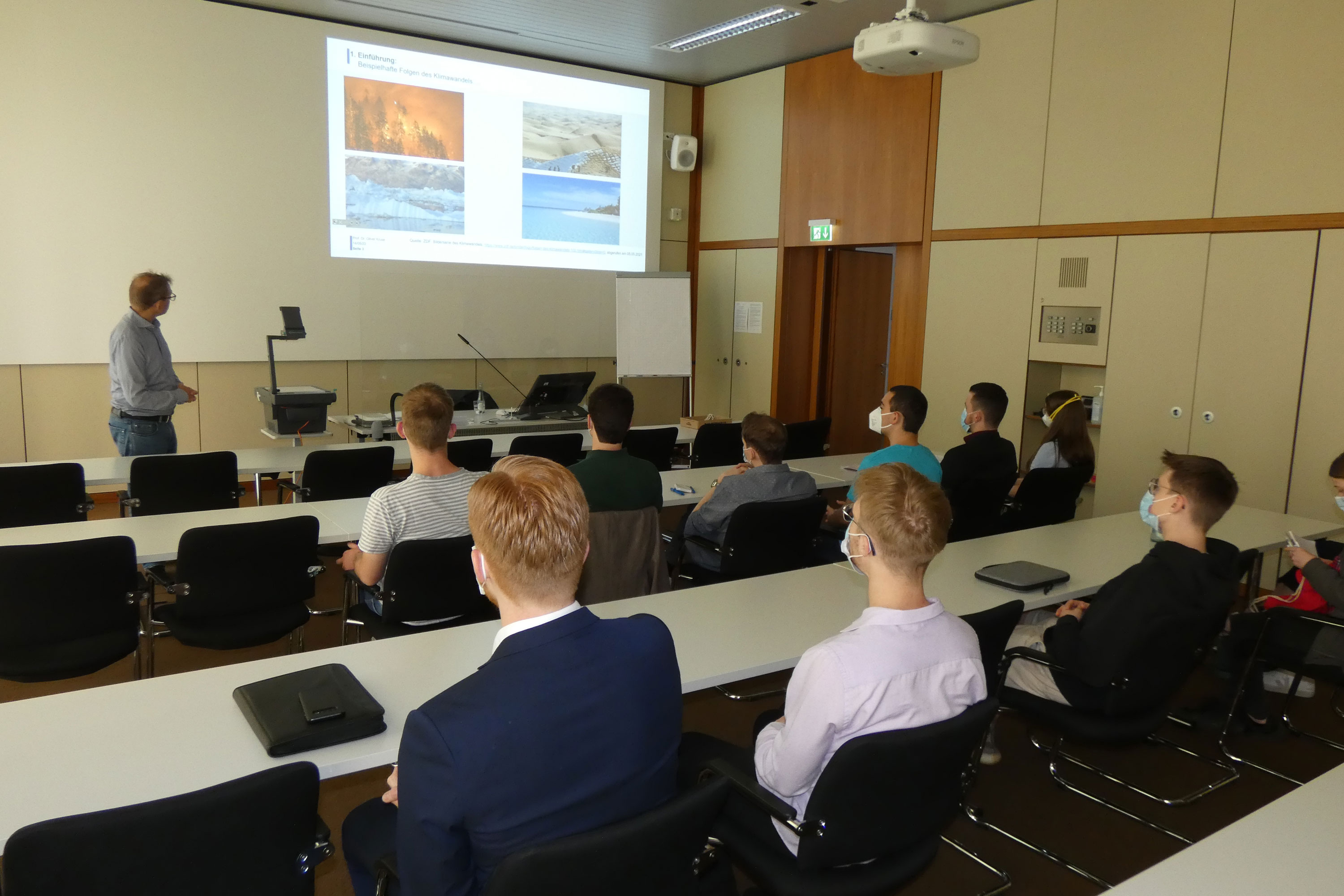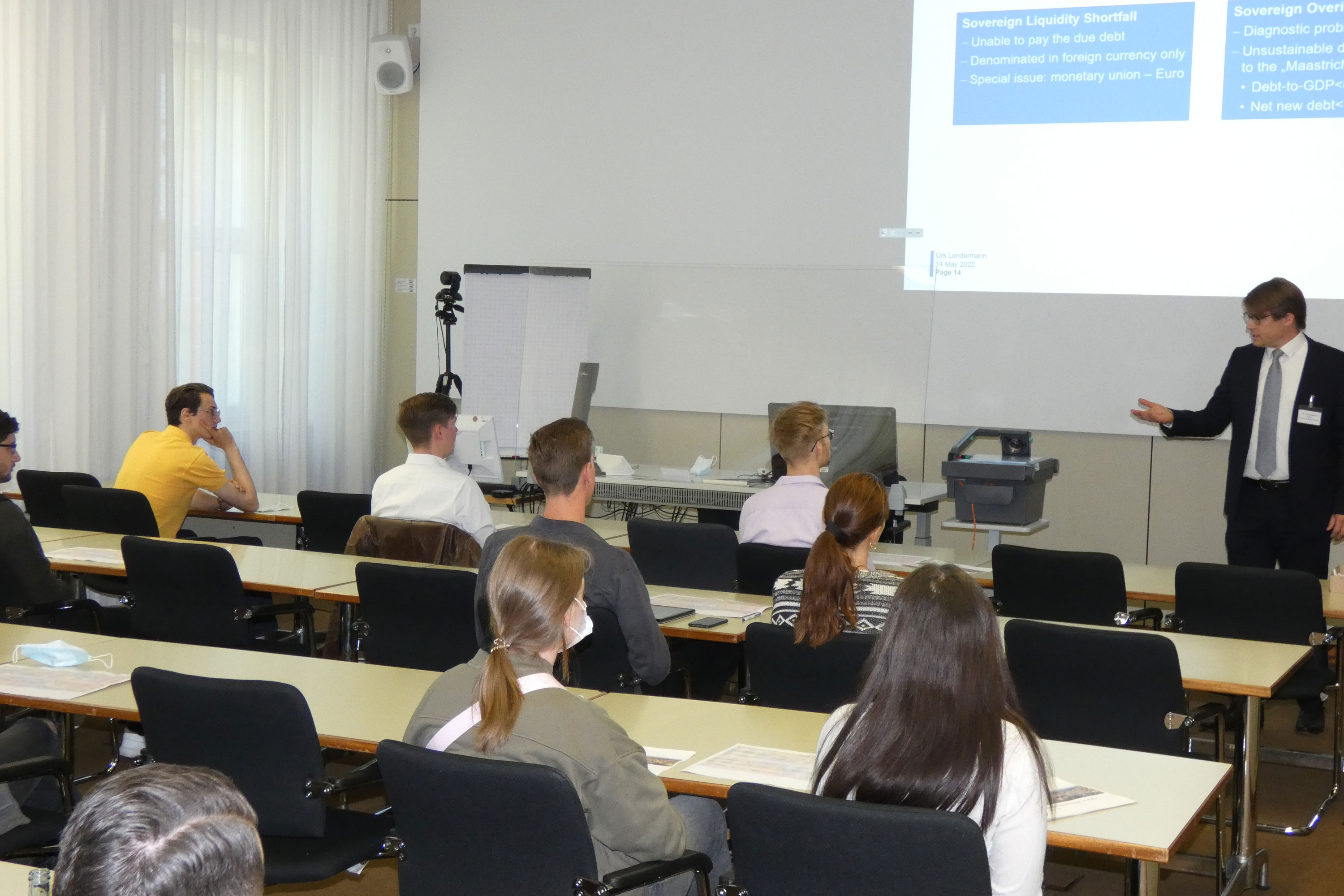 Schnuppervorlesungen der Professoren Urs Lendermann und Oliver Kruse, gaben einen Einblick in die Lehre. Dabei ging es um die Wirtschafts- und Fiskalpolitik der EU in Krisenzeiten sowie um Nachhaltigkeit bei Geldanlagen. Das Interesse der Besucherinnen und Besucher war schnell geweckt, lebhafte Fragerunden schlossen sich in beiden Veranstaltungen an.