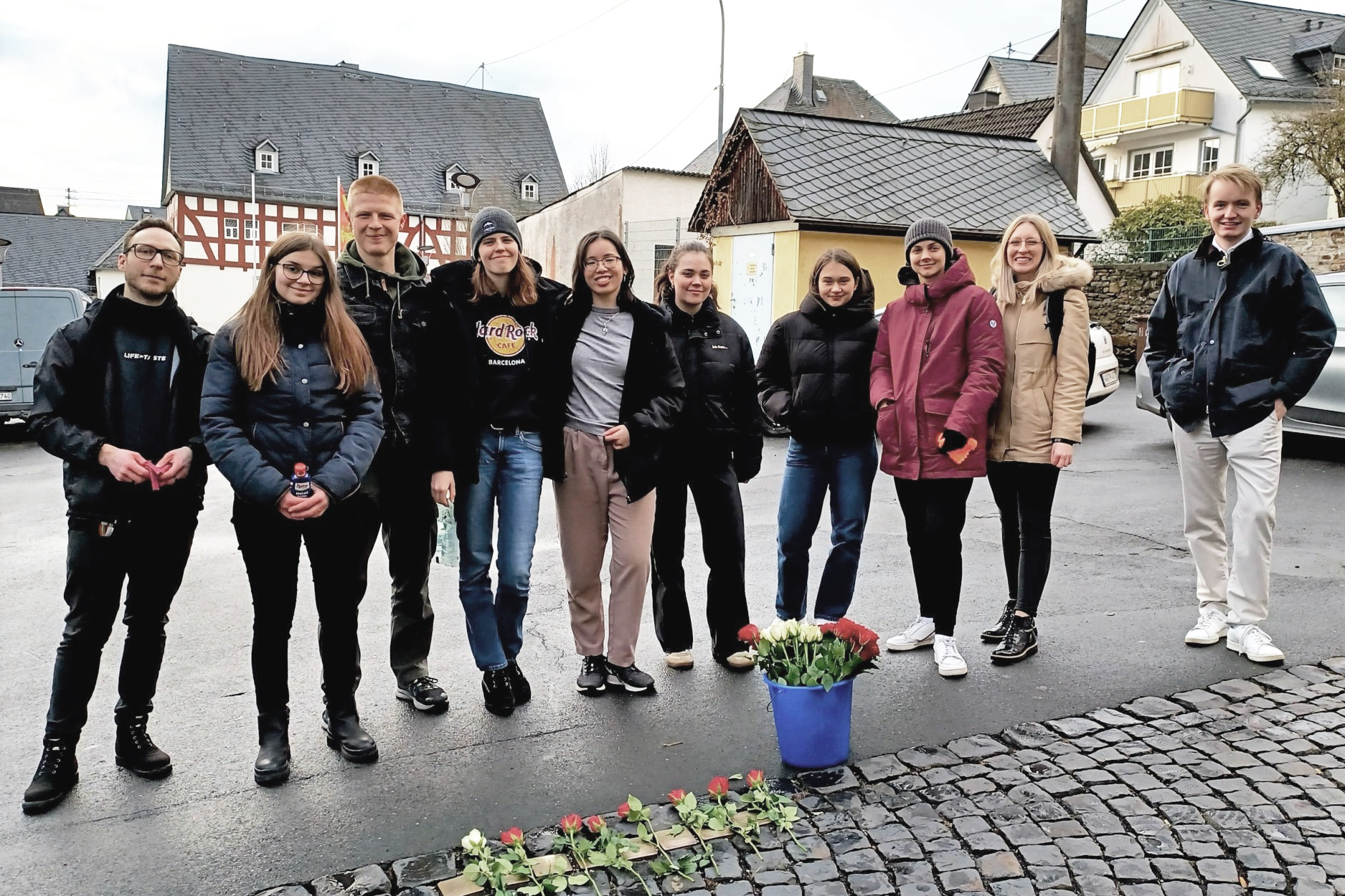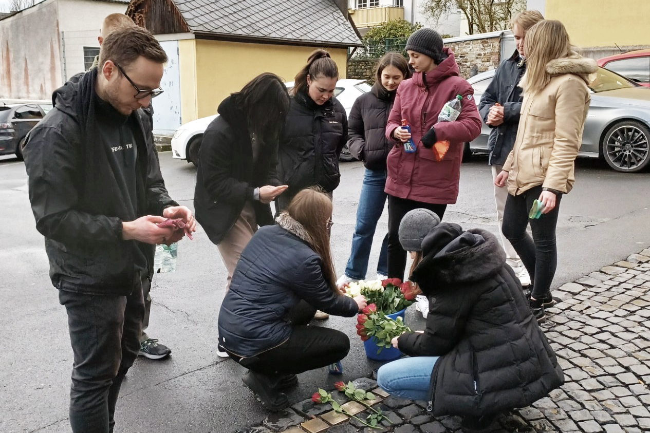 Am Internationalen Tag des Gedenkens an die Opfer des Holocaust reinigten Studierende der Hochschule die Stolpersteine in der Innenstadt von Hachenburg und legten Rosen nieder. ©Dr. Jens Friedhoff, Stadtarchiv Hachenburg