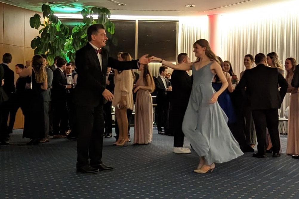 Der Vortragssaal verwandelte sich in einen Ballsaal, mit Sektempfang und Tanzfläche. Zur Unterhaltung wurde den Gästen ein vielfältiges Programm geboten, dass zusammen mit Studierenden und Dozierenden auf die Beine gestellt wurde. Von musikalischen Beiträgen über eine Weihnachtsgeschichte, die auf die offiziellen Akteure der Hochschule angepasst wurde, bis hin zu einer Quizshow – es wurde gelacht, gedacht und getanzt! Tanzeinlagen lockerten das Programm auf und alle Anwesenden konnten ihre klassischen Tanzkünste präsentieren. Damit möglichst viele mittanzen konnten, wurde in diesem Sinne vorab ein Tanzkurs von begabten Studierenden für ihre Mitstudierenden angeboten.