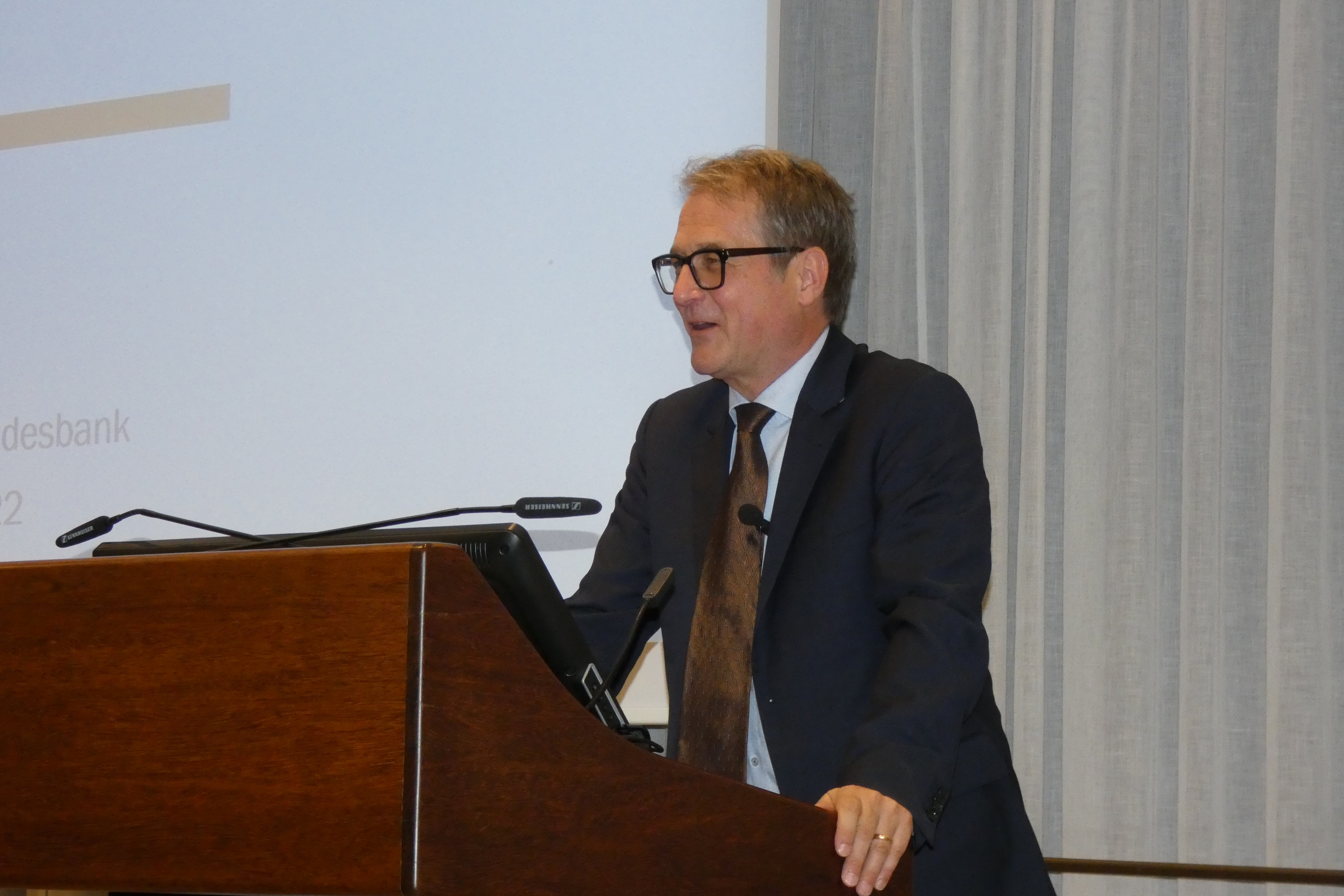 In der Hochschule der Zentralbank ging Wieland natürlich zuerst auf die hohe Inflation im Euroraum ein, die im Oktober mit 10,6 Prozent taxiert ist. „Aber auch ohne Berücksichtigung der Energiepreise liegt sie immerhin bei 6,9 Prozent“, mahnte der Professor der Goethe-Universität in Frankfurt. Für ihn liegt hinter diesen Werten eine Entwicklung, die sich in drei Stufen vollzog: Nach den Hochphasen der Corona-Krise 2020 gab es einen Nachholbedarf im Konsumbereich, es folgten in der zweiten Stufe Lieferengpässe, die vor allem zur Teuerung von Vorprodukten führten, aber auch ein Engpass bei den Arbeitskräften. Die dritte Stufe war dann der Ausbruch des Ukraine-Kriegs im Februar 2022, der vor allem Energie- und Erzeugerpreise gewaltig verteuerte.