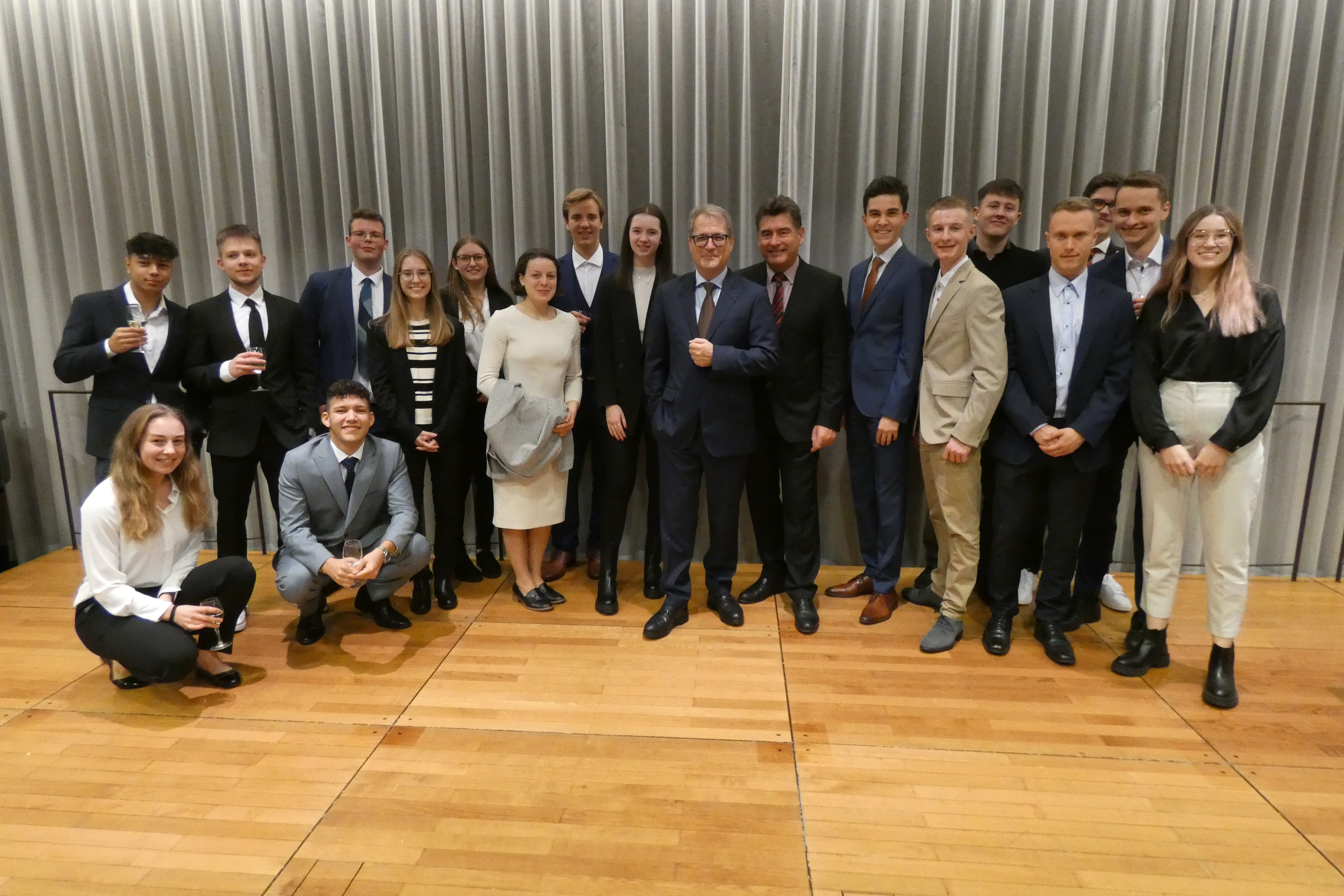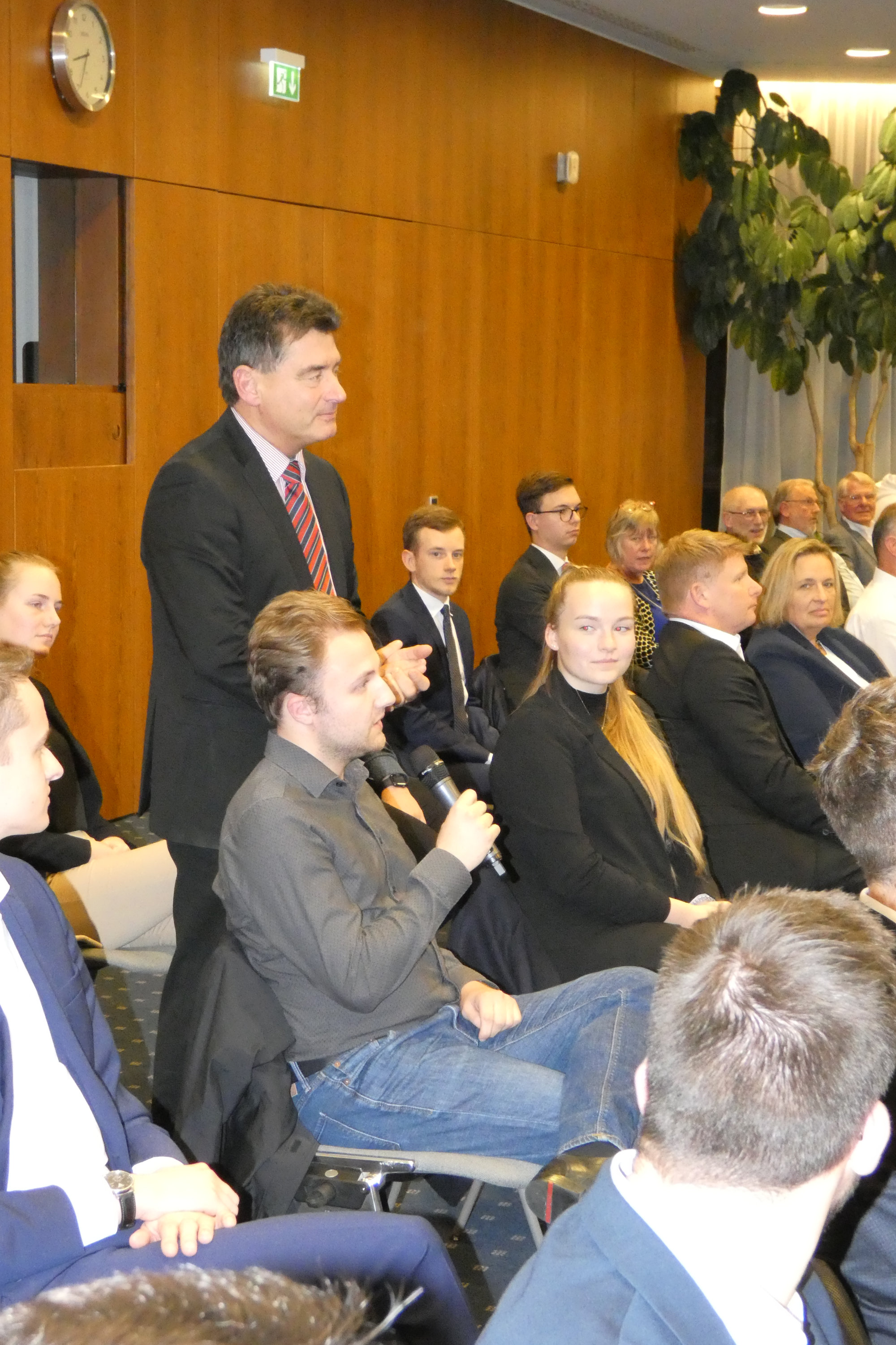 In der folgenden, gut 45-minütigen offiziellen Diskussionsrunde fragte ein Student den Redner, ob er eine Lohnpreisspirale befürchte. „Wir sind schon mittendrin, wie die aktuellen Abschlüsse in der Metallbranche zeigen“, erwiderte Wieland. Er erwies darauf, dass die 20-prozentige Anhebung des Mindestlohns per Gesetz auch zu einer stärkeren Anhebung der Tariflöhne beitragen werde.
