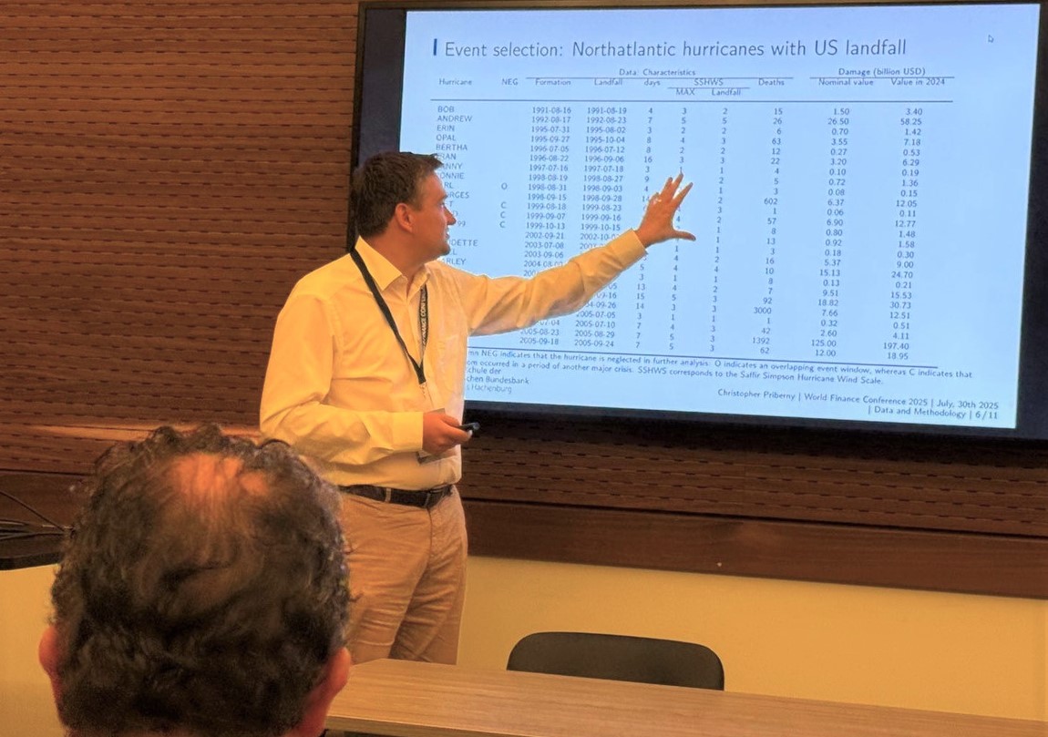 Professor Priberny stellte im Rahmen der Konferenz aktuelle Forschungsergebnisse zum Thema „Effect of Hurricanes on the US Financial Market“ vor, die er in Zusammenarbeit mit Julius Awick, ebenfalls ein Absolvent der HDB, und Dr. Christian Kreuzer erarbeitete. Die Präsentation stieß auf großes Interesse und regte zu einem lebhaften Austausch unter den Teilnehmenden an, wodurch die Autoren Feedback für die Weiterentwicklung des Forschungsprojekts gewinnen konnten.