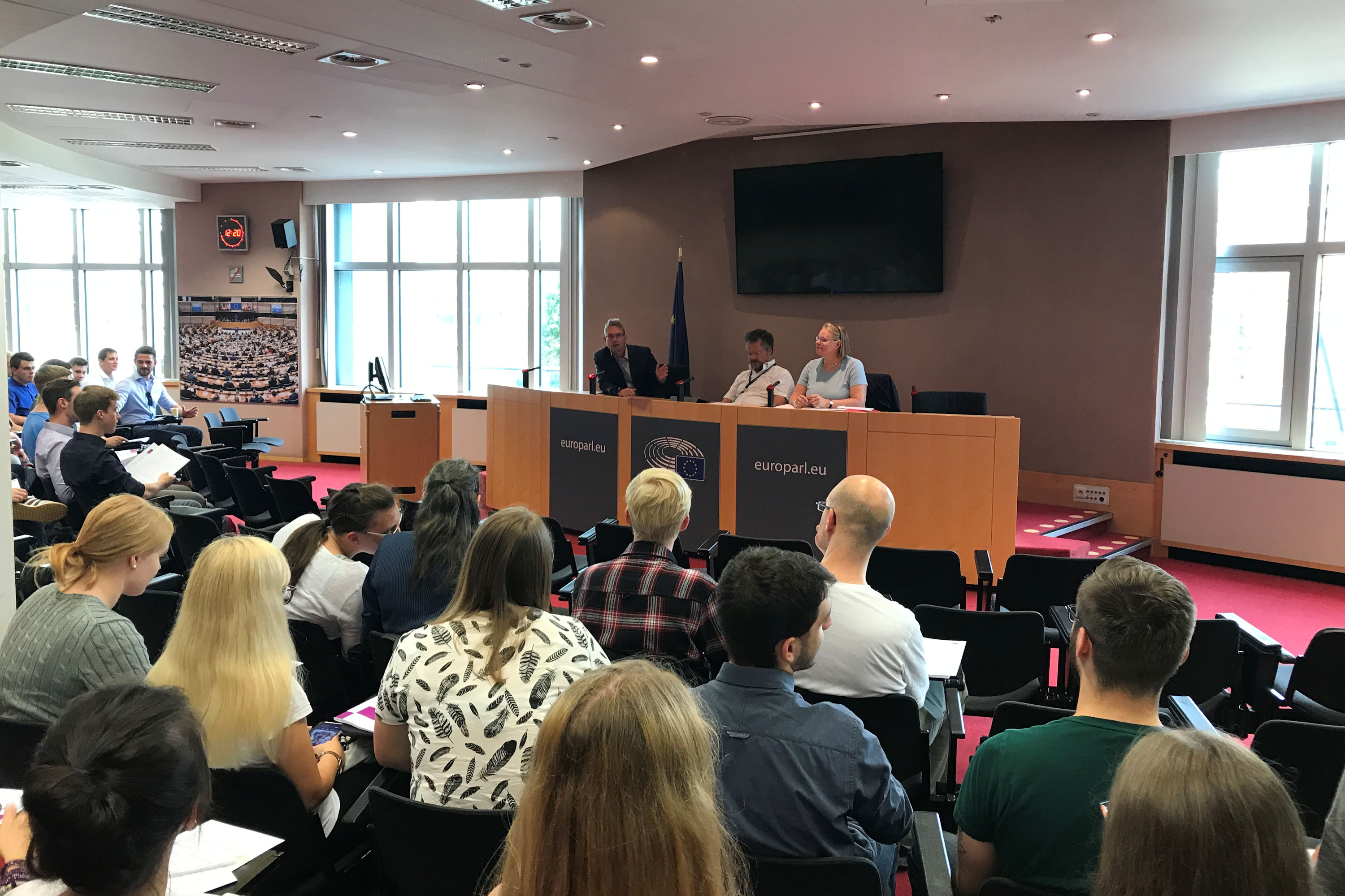 Die Studierenden informierten sich zum einen über die Funktionen des Parlaments, wie die Gesetzgebungs-, Budget- und Kontrollfunktion, zum anderen auch über die konkrete Arbeit der zwanzig ständigen Ausschüsse und der beiden Unterausschüsse, deren Arbeit vorbereitend in die Plenarsitzungen einfließen. Wie genau ein solcher Ausschuss arbeitet, erfuhren sie im Vortrag zweier Vertreter des Ausschusses für Wirtschaft und Währung (ECON), am Beispiel wie Beschlüsse und Empfehlungen der EU-Organe und internationaler Organisationen in konkrete Rechtsvorschriften umgewandelt werden. Eine wichtige Erkenntnis für alle: Die Ausschussmitglieder beziehungsweise die Abgeordneten des Parlaments stehen in ihrer politischen Arbeit permanent in einem Spannungsfeld zwischen ihren Wählern, denen sie ihren persönlichen Einsatz versprochen haben, der eigenen Partei, deren politischen Ziele sie sich verpflichtet fühlen, und den zahlreichen Interessenvertretern, die oftmals Entscheidungen zum Wohl der heimischen Wirtschaft einfordern. In der sich anschließenden Diskussion standen aktuelle Themen, wie der Europäische Einlagensicherungsfonds (EDIS) und die Auswirkungen eines harten Brexits auf die Finanzmärkte, im Vordergrund.