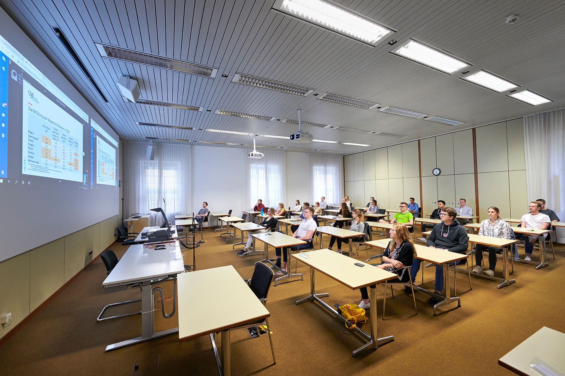 The seats in the large lecture hall in Hachenburg were visibly spaced out. All 60 registered visitors wore face masks as they made their way to their designated seats. A video camera was installed in front of the lectern, streaming the event to a neighbouring lecture hall and to other students watching from home. The Bundesbank’s University of Applied Sciences had planned its first public event in months meticulously in order to allow as many people as possible to attend.